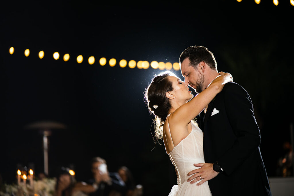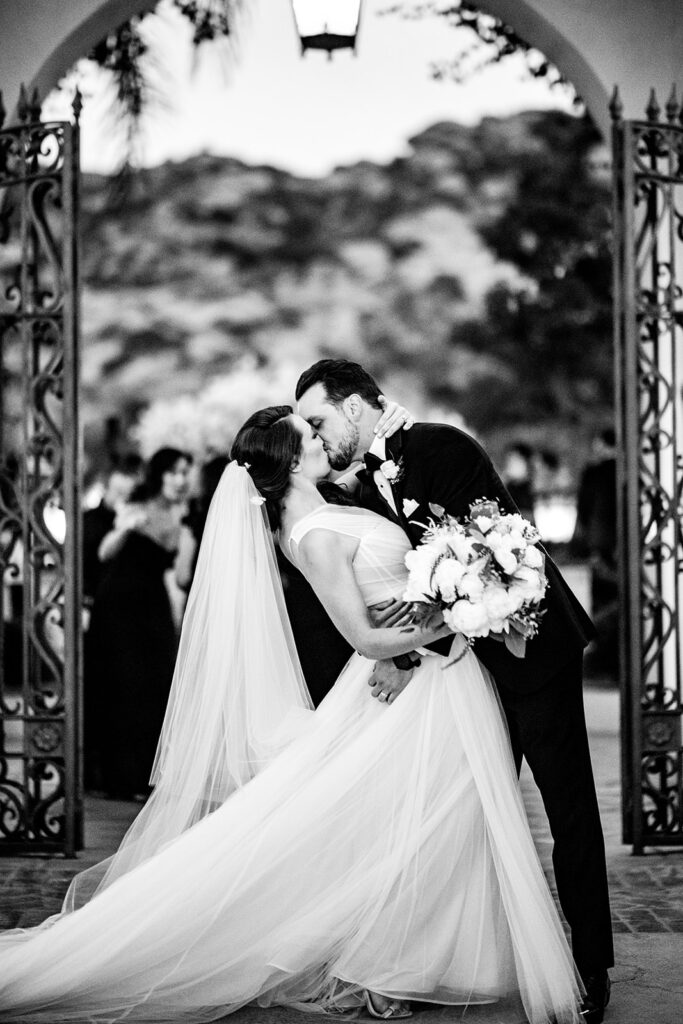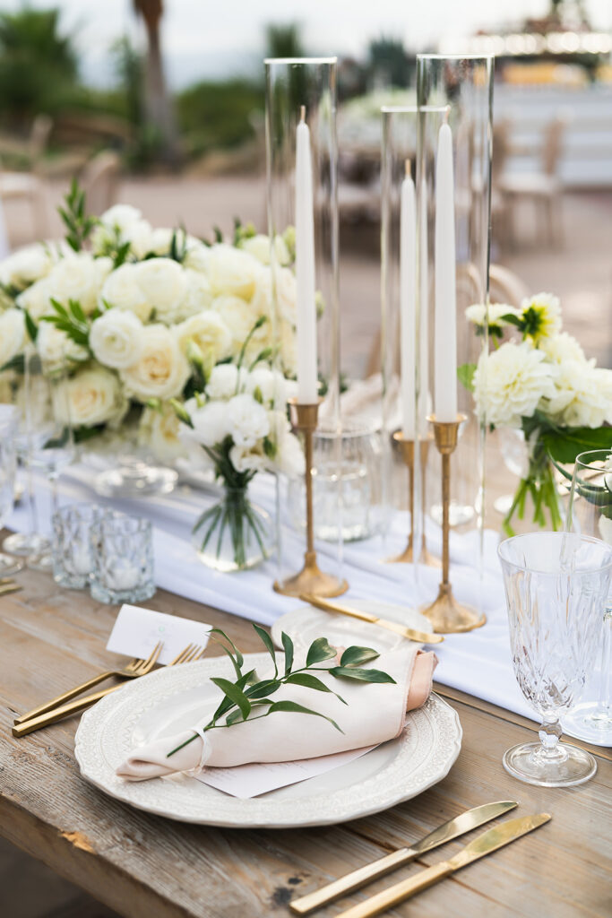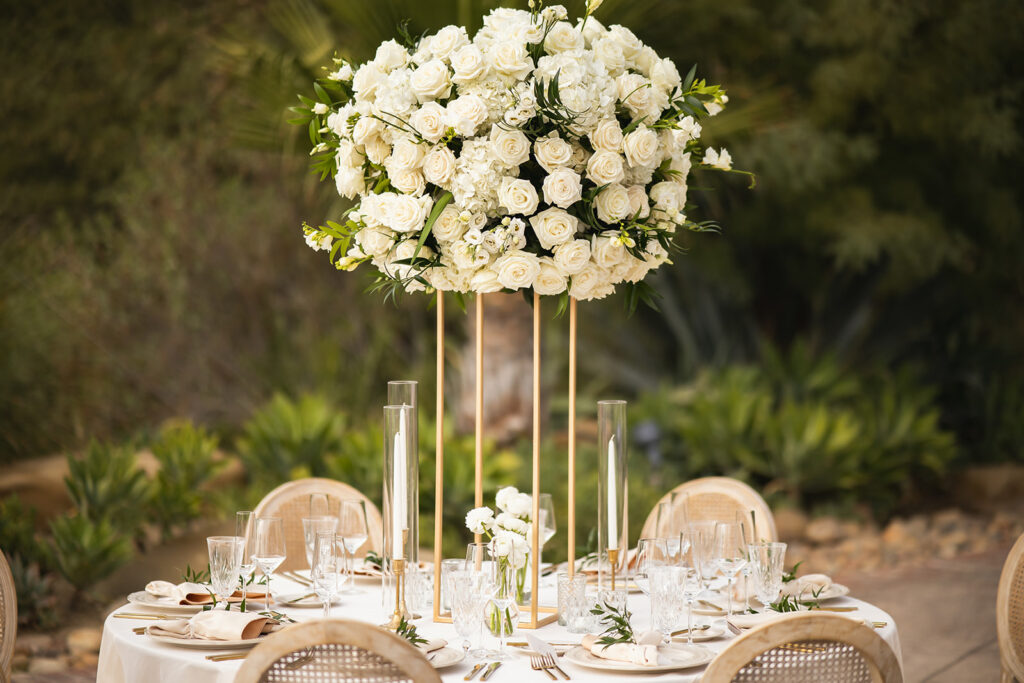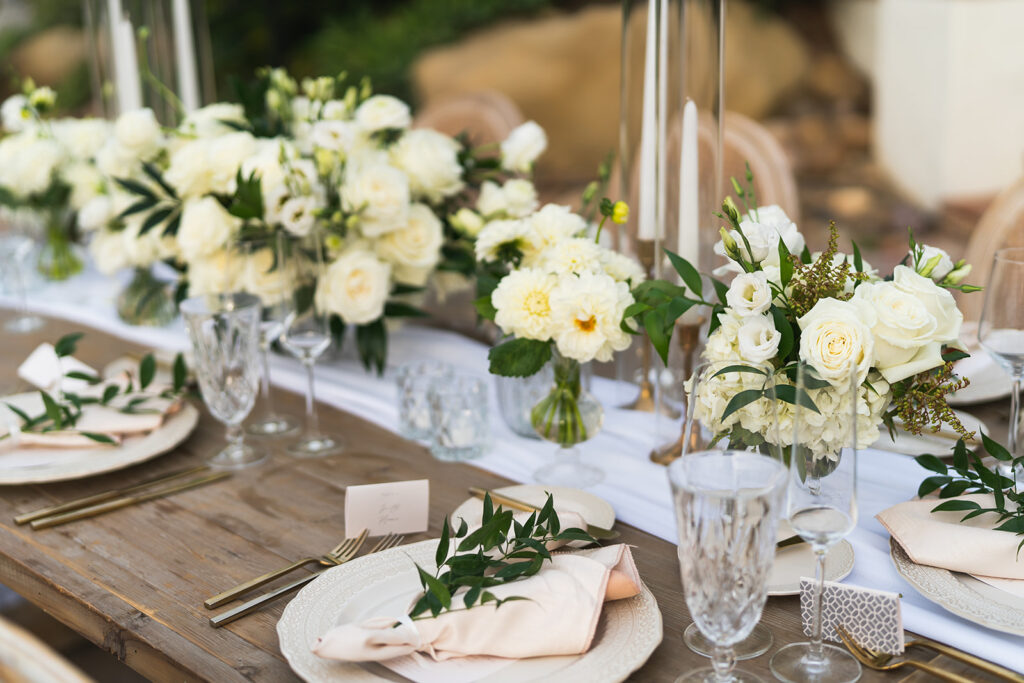 Just before the outbreak of COVID, Angela and Bryan discovered Natalie Sofer Weddings and Events through the approved vendor list at South Park Center. As circumstances evolved, we thoughtfully reimagined their celebration, transitioning from a 200-guest event to an intimate outdoor wedding for 68 close friends and family at Hummingbird Nest Ranch. While the original design featured rich burgundy tones and lush greens, we refined the aesthetic into soft whites and vintage-inspired elegance—perfectly suited to the natural beauty of the villa. The result was an intimate, romantic experience that felt warm, welcoming, and deeply personal. A live band played everything from Queen classics to today’s favorites, keeping the energy joyful and spirited throughout the evening. Despite the shift, guests felt the love and intention in every detail, and Angela and Bryan later shared that it was truly the best day of their lives.