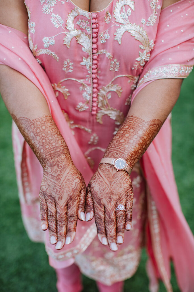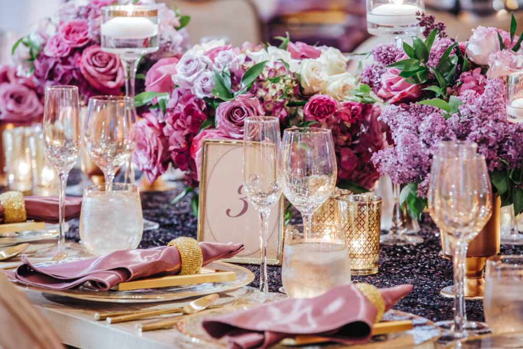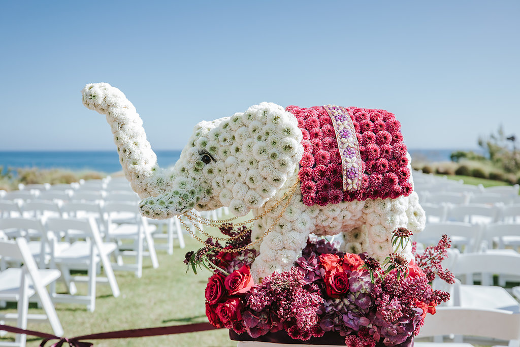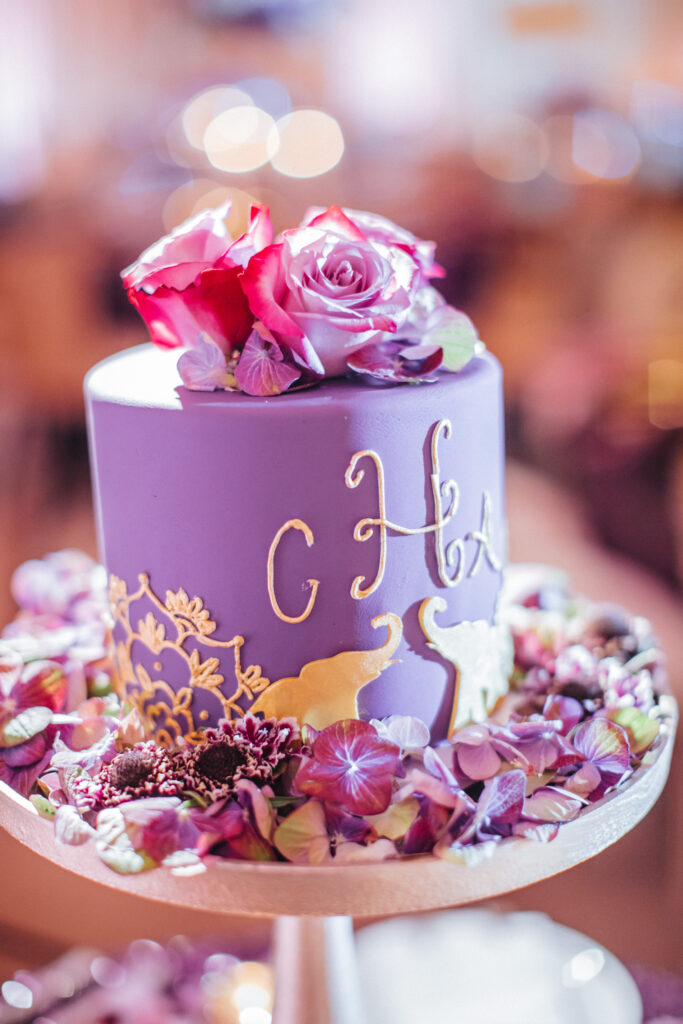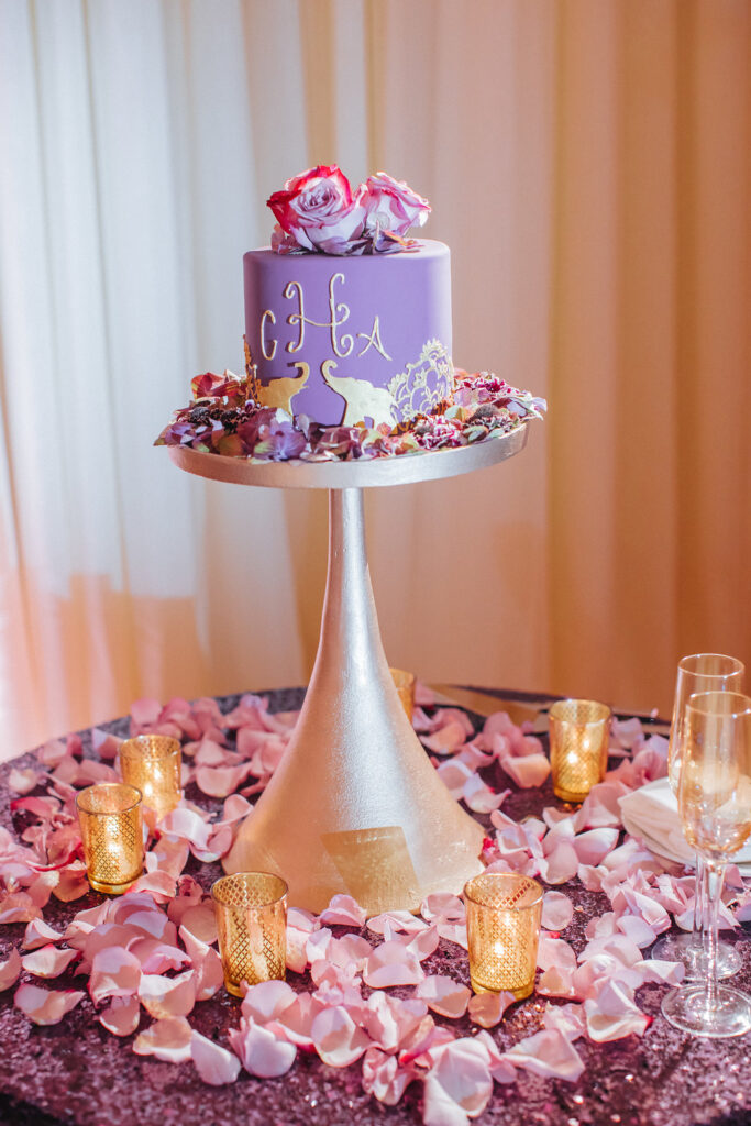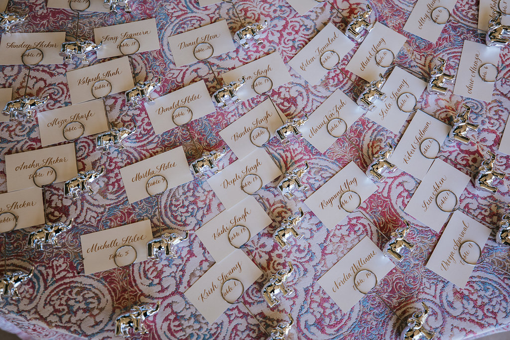 To honor Aasha’s Indian heritage, a stunning two-foot floral elephant—crafted from white roses with soft purple accents—served as a centerpiece, complemented by baby elephant details and custom place cards throughout the venue. Guests enjoyed Indian curry prepared by a renowned Indian chef alongside thoughtfully curated cuisine, with music blending Indian and American influences.